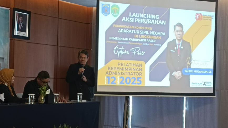 Samarinda, 29/8/2025 - Saipul Mujahidin, SE, seorang peserta Pelatihan Kepemimpinan Administrator (PKA) Angkatan 12 Tahun 2025 selaku Kepala Bidang Pengembangan, Mutasi dan Promosi pada BKPSDM Kabupaten Paser meluncurkan Aksi Perubahan berupa Peningkatan Kompetensi Aparatur Sipil Negara di Lingkungan Pemerintah Kabupaten Paser (Penyusunan Perencanaan Pengembangan Kompetensi Sumber Daya Manusia) atau dapat disebut OPTIMA PASER yang bertujuan untuk meningkatkan kompetensi Aparatur Sipil Negara (ASN) yang ada di Lingkungan Pemerintah Kabupaten Paser.