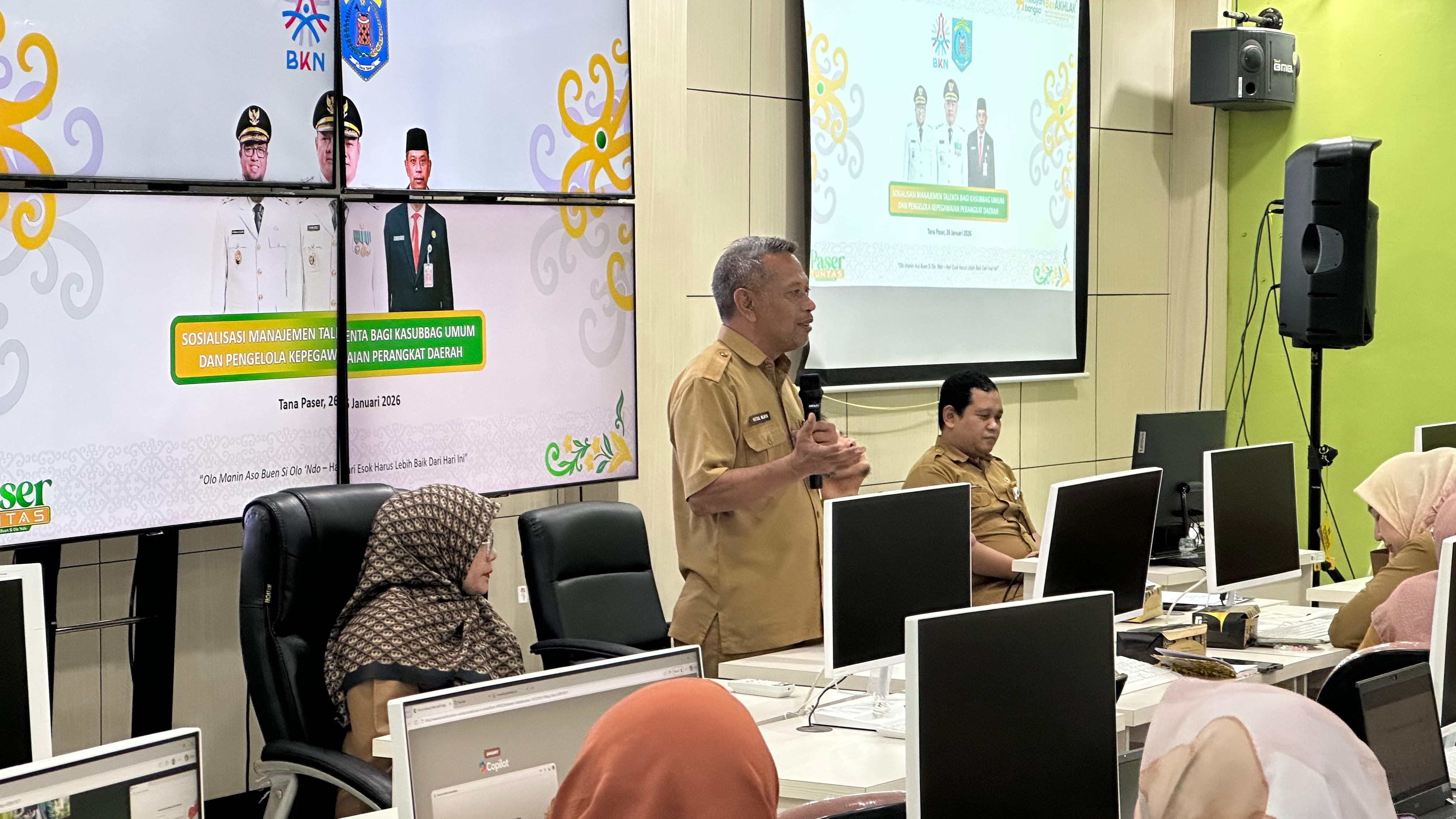 TANA PASER, 29/01/2026 – Dalam upaya memperkuat implementasi sistem merit dan meningkatkan kualitas tata kelola Aparatur Sipil Negara (ASN), Badan Kepegawaian dan Pengembangan Sumber Daya Manusia (BKPSDM) Kabupaten Paser menggelar kegiatan Sosialisasi Penerapan Manajemen Talenta. Kegiatan ini ditujukan bagi seluruh Perangkat Daerah di lingkungan Pemerintah Kabupaten Paser.